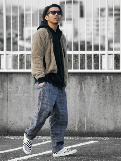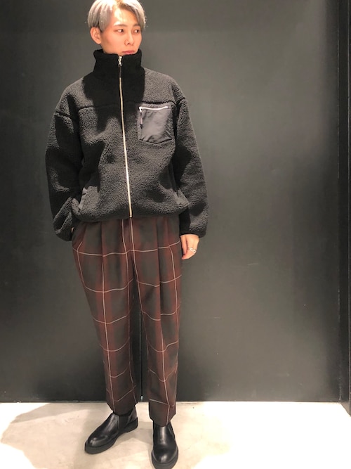 ゆったりとしたチェックのワイドテーパードパンツと合わせてますね!ボアブルゾンが暖かいのでインナーはそこまで着こまずともOK!