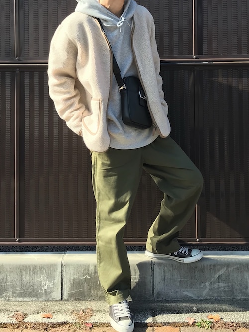 太めのカーキのチノパンとグレーのパーカースタイルはこれだけでも結構好きです。