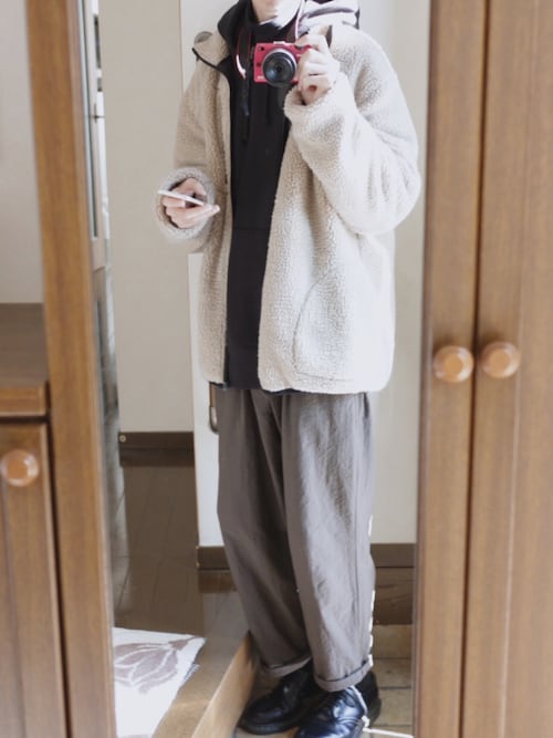 これは個人的に好きなスタイルによって分かれますが、ボアブルゾンを使うならゆったりとラフカジュアルに決めたいと思ったので、上下ともにゆるっとしているこちらにしました。(チェックパンツはこの後購入しましたw)