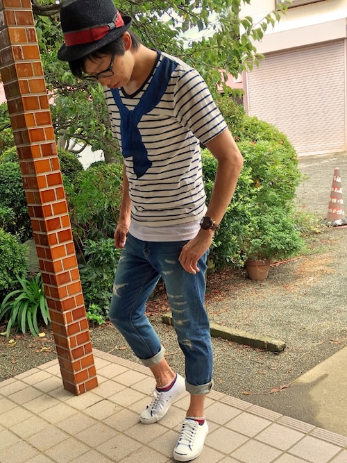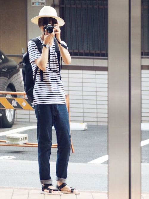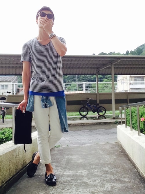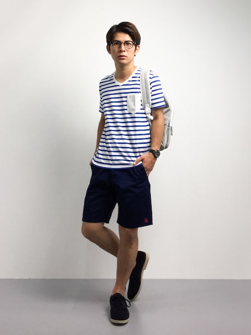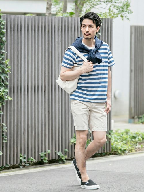 青と白が等間隔ではいっていますね!ボーダーの幅によって印象は変わりますが色合いやハーフパンツとの合わせ、シャツを肩がけしてるところはオシャレポイントですね!