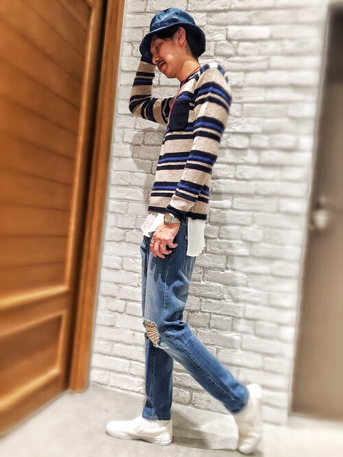 白にブルーのラインが入ったボーダーです!白Tを重ね着してチラ見させることでオシャレ度アップです!プロデューサー巻きかと思いきやこれはTシャツプリントですね!可愛いTシャツです!