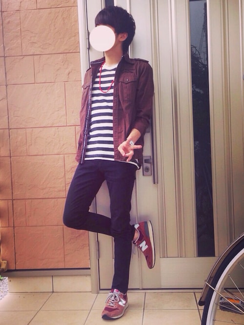 ミリタリーシャツの下に白黒のボーダーが爽やかさを演じていますね!インナーを無地ではなくボーダーにすることで爽やかさとオシャレさがアップします!