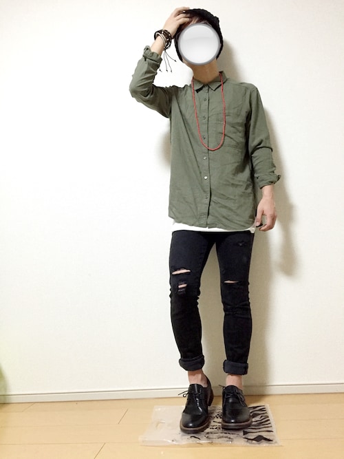 カーキシャツにダメージ黒パンツを合わせた男らしいミリタリースタイルです!カジュアルになりすぎない為にドレスシューズで合わせています!