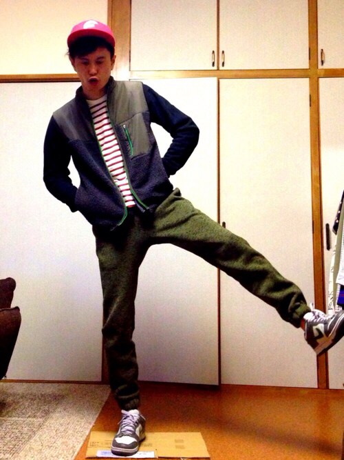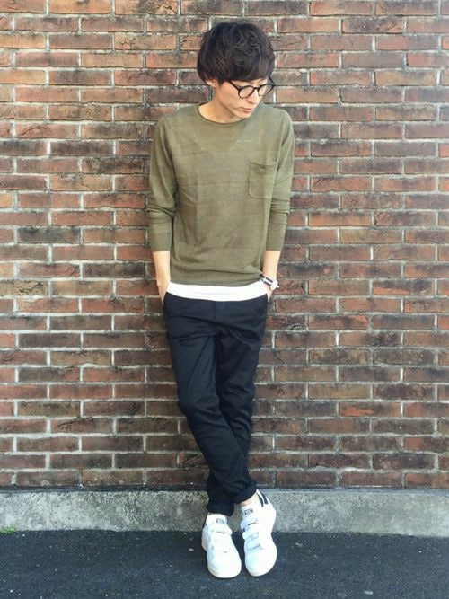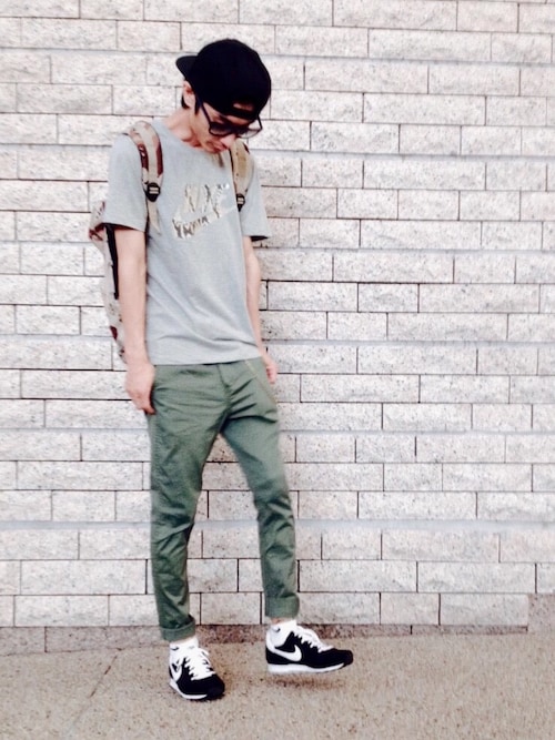 シブいカーキのパンツをロールアップさせてナイキのスニーカーを強調させているスタイルです!シンプルだけどもこんな合わせ方も参考になります!