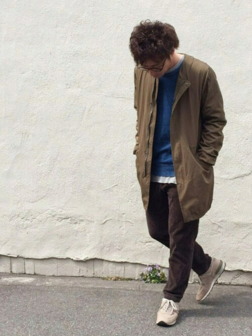 ノーカラーモッズコートにカーキを選んだゆったりスタイルです!全体的な色合いがあっていてミリタリーな大人コーデですね!