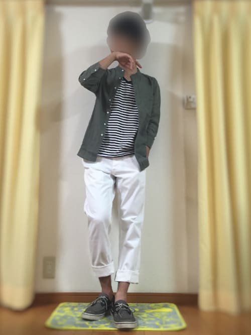 今季流行りのバンドカラーシャツにカーキ色を使用しています!白パンツにボーダーがとても爽やかで夏を感じるコーディネートです。
