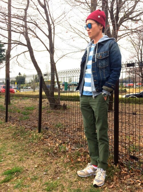 カーキのチノパンを使った爽やかコーデです!デニムジャケットとの色合いもバッチリです!
