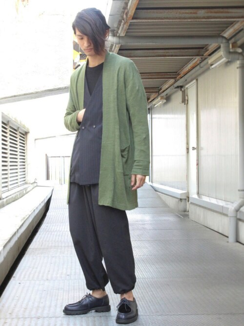ロングのカーディガンとノーカラージャケットを合わせて袴っぽく着こなしています!まさに日本男児コーディネートです!