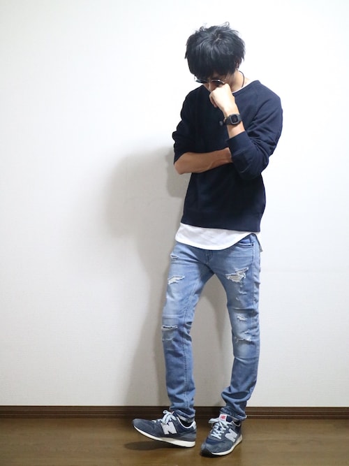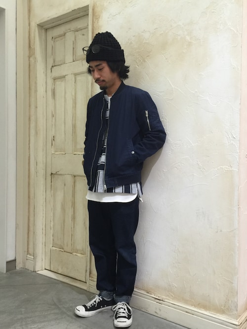 ネイビーコーディネートの中でちょっと出ているレイヤードの白がとても映えていて素敵なコーディネートです!カモフラ柄も合っていますね!
