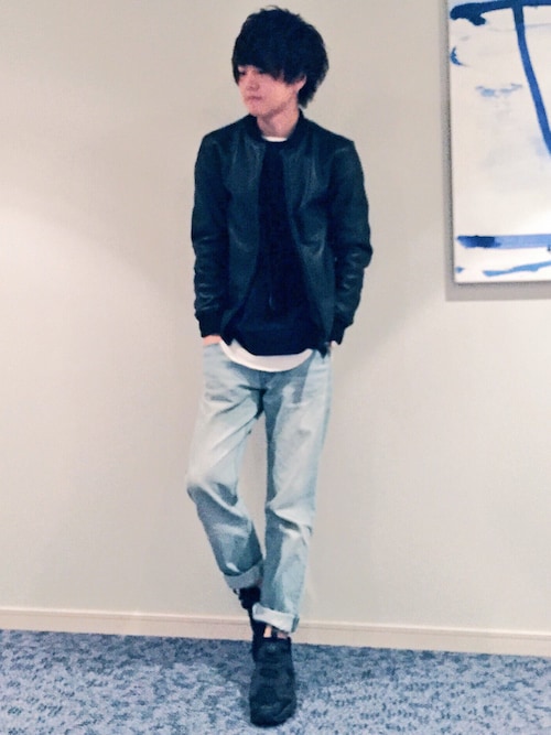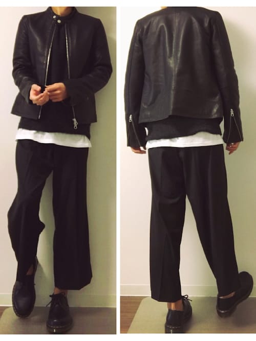 バシッと全身黒で決まっていますが、全身真っ黒ではなく白Tシャツをのぞかせているのはとてもオシャレなレイヤードスタイルですね!