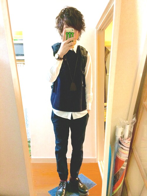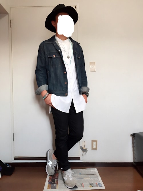 Gジャンにバンドカラーの白シャツを合わせたスタイルです!ただの白シャツではなくバンドカラーでスッキリな上にロング丈なのでうしろ姿も凄くカッコいいスタイルです!