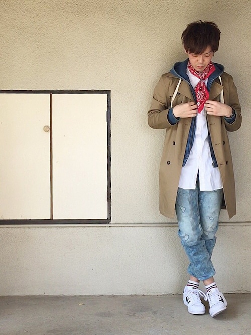 綺麗なロング白シャツスタイルです!綺麗になりすぎないようにいたる所にカジュアルをもってきており、バンダナスカーフスタイルも今流行りです!
