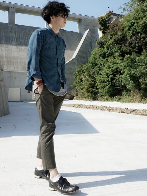 きまってますね!オシャレポイントとしてはBLUE BUCKのシャツの下からレイヤードでTシャツをだし、9分パンツで足元を爽やかに出しています!