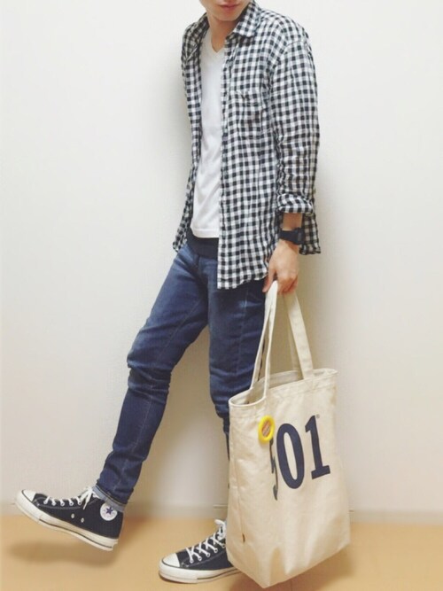 春を感じる爽やかなコーディネートですね!ギンガムチェックのシャツとインナーの白ボトムスはブルージーンズと全体的に凄く合っていて素敵です!