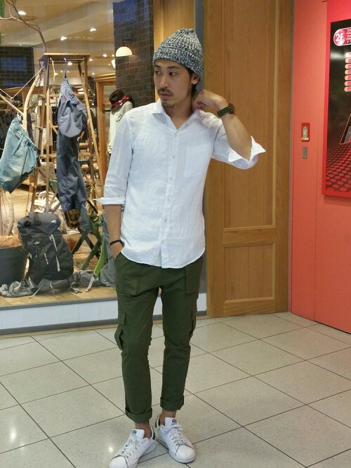 白シャツ白スニーカーでカーキを挟みこんでいます!とても清潔感溢れる綺麗なコーディネートですね!