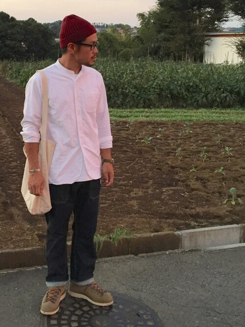 こちらも濃紺デニムと合わせてます!デニムとダナーのブーツも凄くしっくりきますね!凄くシンプルですがバンドカラーシャツを使用したコーディネートです!