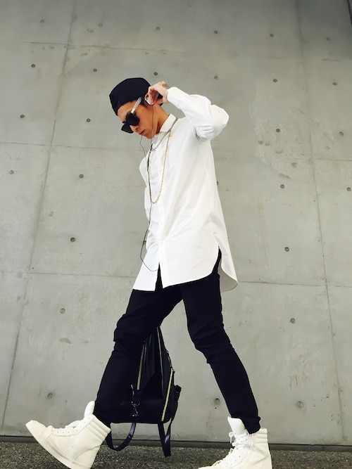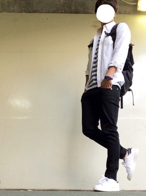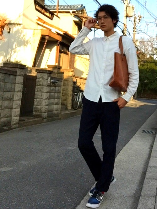 白と黒を合わせた王道モノトーンスタイルです!シンプルなコーデですが、シャツもパンツもしっかりとサイズが合っていてスニーカー、バッグ、伊達メガネとアイテムを足すことで凄くオシャレなコーデに感じます!