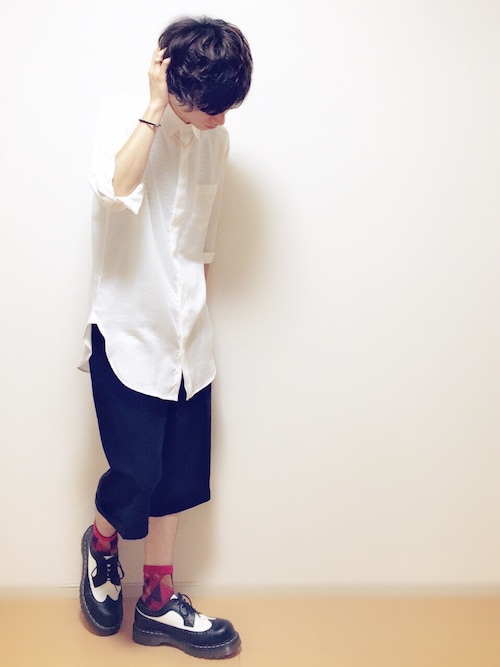 少し大きめのロングシャツがゆったり感をだし、ゆったりしたハーフパンツとの相性も抜群です!足元はスニーカーではなくドレスシューズを履いたりトップスとの白合わせだったりもオシャレのポイントです!