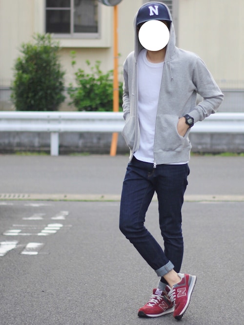 王道なパーカーの着こなしです!シンプルですが、凄くカッコいいです!インナーに白のTシャツボトムは濃紺デニムをロールアップして足元に赤のニューバランスです!