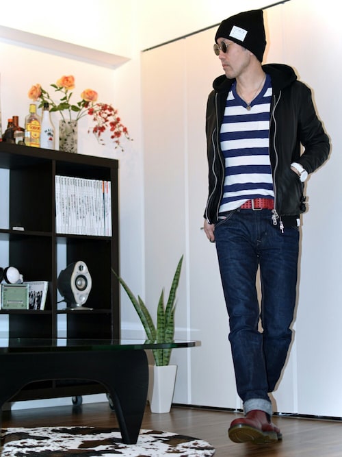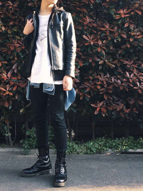 トップスにライダースを着て男らしいスタイルです!ライダースを脱いでパーカーだけになったとしてもバッチリ決まります!