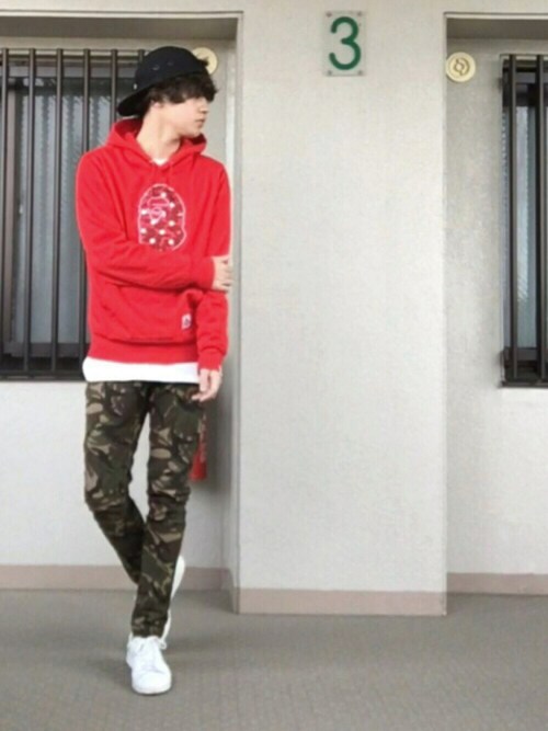 赤がとても綺麗なコーデですね!カモフラパンツは少しゴチャゴチャしてる様に見えますがシンプルにまとめればとても使いやすいです!