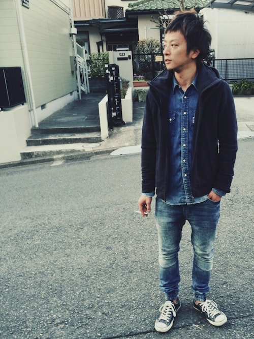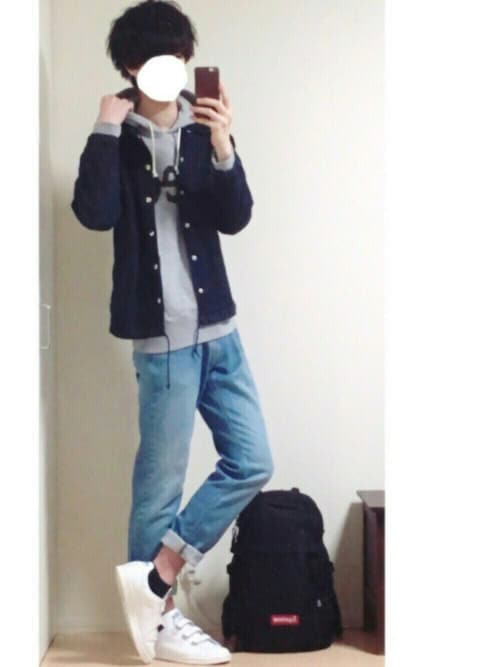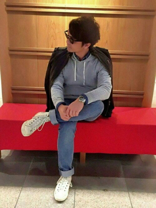 さりげなくトップスの色とスニーカーの色を合わせていたり…くるぶしが少し見える程度ロールアップをしていたり…パーカーは少し長めにし、デニムジャケットを短くすることで、腰の位置をごまかし、足長の効果も出ていますね!そんな事する必要ないくらい足長そうですが(笑)