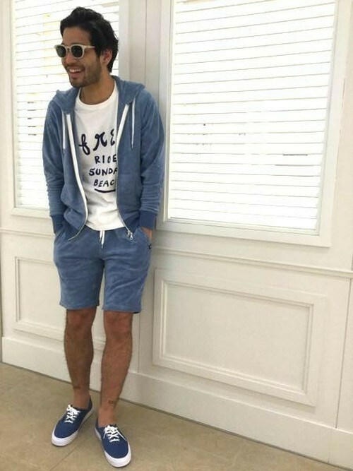 ネイビーというよりもブルーに近いですが、パイル生地のパーカーは夏でもイケますのであるとちょっと普段のパーカーとは違う感じを出せます!