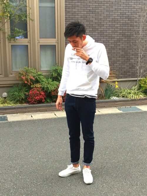 白パーカー王道はやはり濃紺デニム(黒パンツでも可)と合わせたスタイルですね!トップが薄い色なのでボトムスに濃い色を持ってくるのがベストですね!