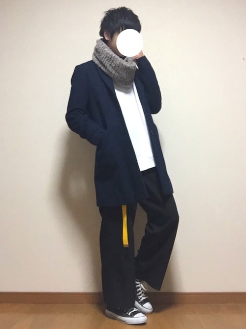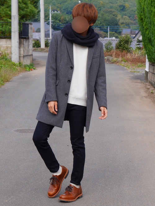 グレーのチェスターコートとの相性バッチリ!インナーは明るく白をもってきています!パンツが黒なのでスヌードの黒と合わせると見た目綺麗ですよね!