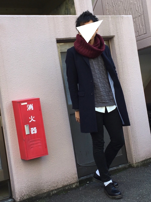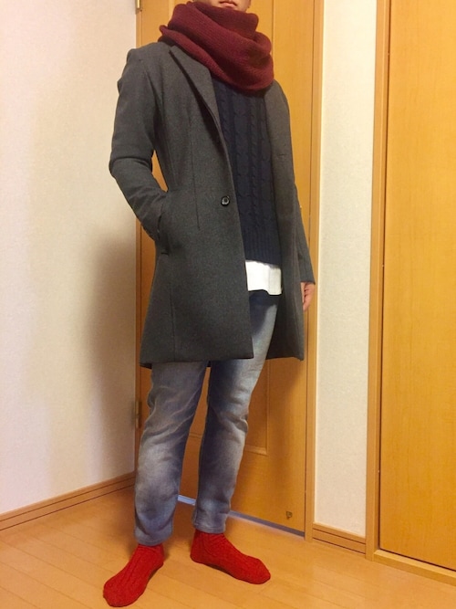 ベージュチェスターコートとワインレッドスヌードの合わせです!外を明るい色で攻めた分インナーはモノトーンでしっかり統一してますね!脱いでもカッコイイスタイルですね!
