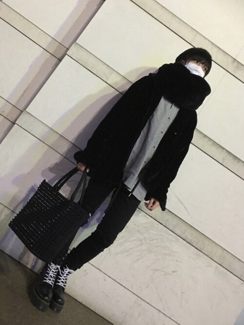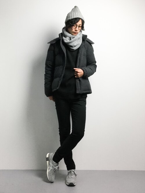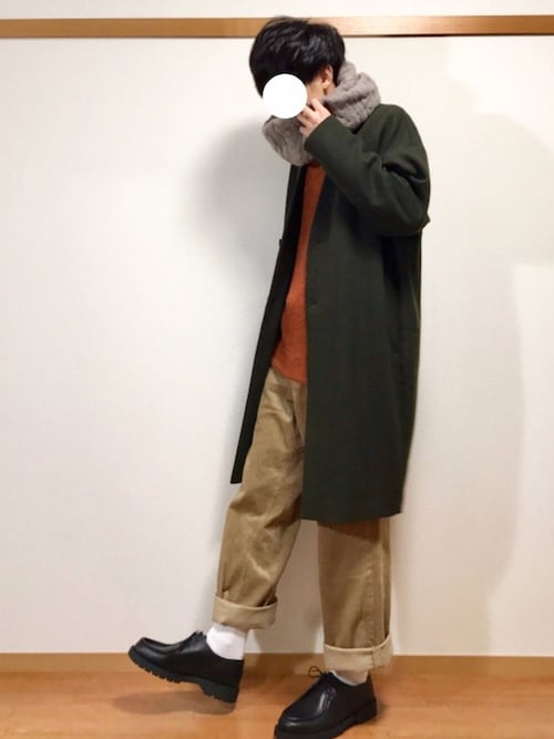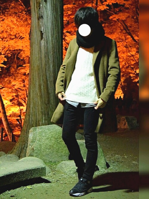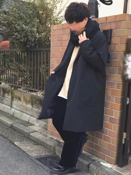 黒のコートに黒のスヌードですが、インナーに明るい色をもってくる事で暗くなりすぎず良い冬感ですね!全体的に少しゆるめなコーデですが凄くオシャレに見えます!
