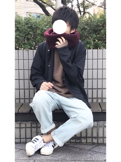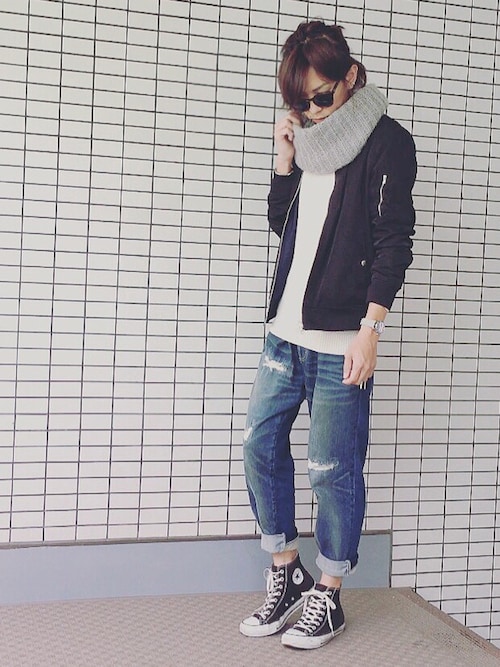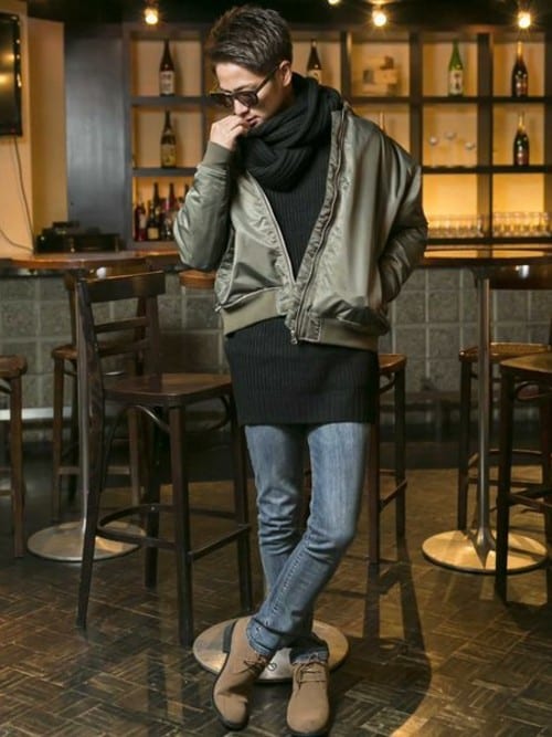 流行りのMA-1との相性もバッチリですね!長めのインナーをもってくる事でスヌードなしでもとってもカッコイイですが、スヌードをまく事で更に綺麗な逆三角形スタイルを作っています。