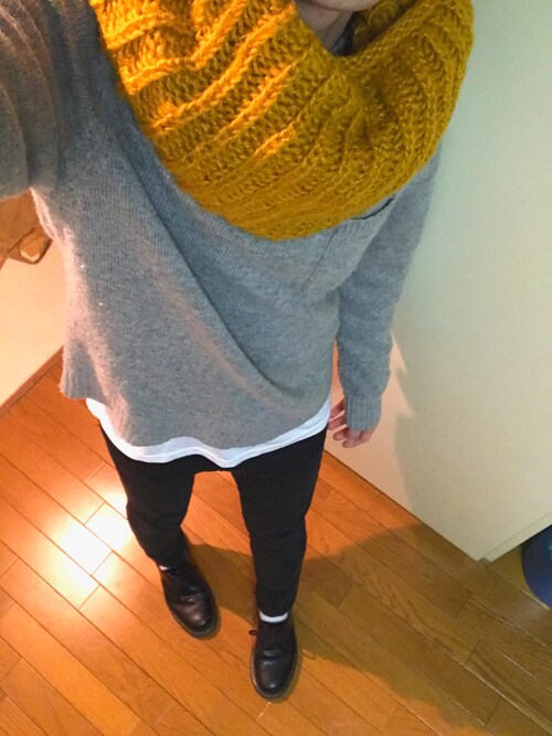 ニットのグレーと靴のグレーと合わせてグレーのスヌードをもってきたコーデですね!他を黒で統一してるので色がとっても映えてみえますね!