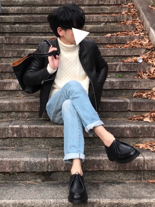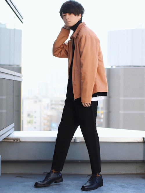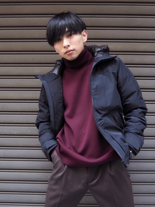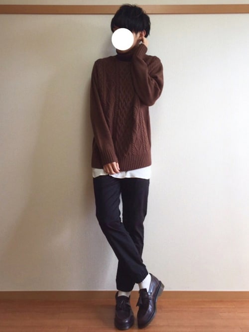 茶色のタートルネックが少し可愛い系男子をかもしだしてますね!白シャツをちょこっと出し、チラ見せの靴下の白と合わせていますね!タートルネックセーターのもえ袖は女の子もキュンキュンしちゃいますよ!