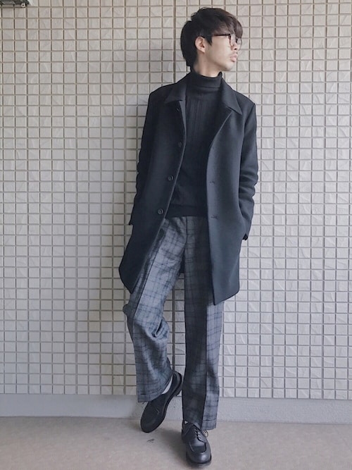 タートルネックに少しゆったりした太目のパンツを合わせています!ロングコートでシルエットもバッチリですね!