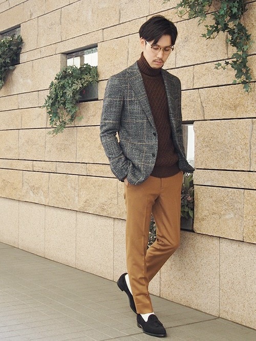 渋めの茶色タートルネックはジャケットと合わせて大人カジュアルで!綺麗めスーツスタイルに合わせてとってもオシャレに仕上がってます!