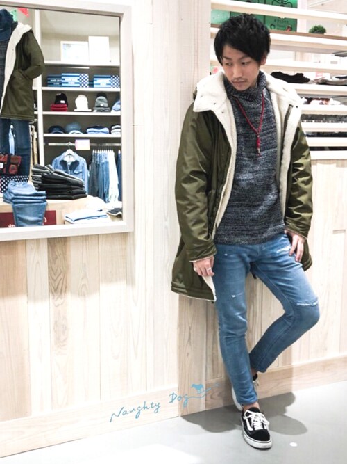 タートルニットとモッズコートの組み合わせですね!ラフな大人カジュアルスタイルです!コートを脱いでも落ち着いた感じに見えると思います!そしてシルバーじゃなくても長めのアクセサリはやっぱりタートルニットに合いますね!