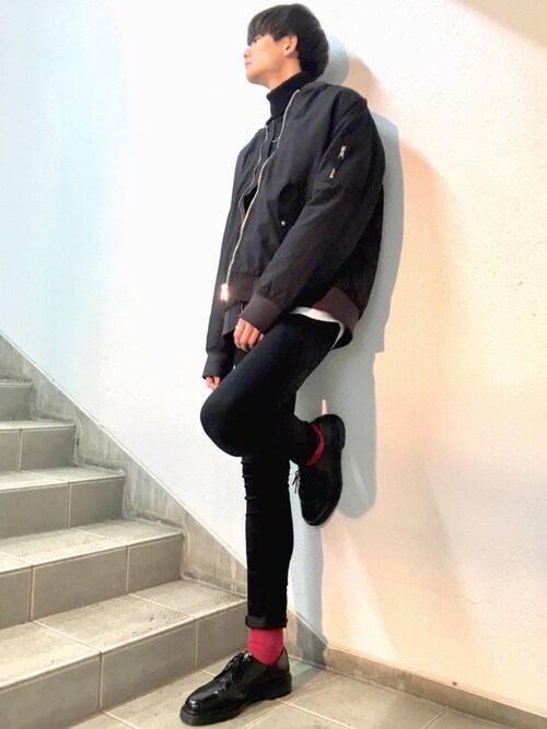 少し大きめなMA-1も黒でそろえた上で靴下で色を外してますね!とても勉強になります。冬はコート必須ですが、脱いでもカッコイイを目指す為にもここは抑えておきましょう!