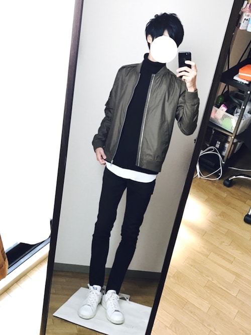 カーキのMA-1との相性最高ですね!本当に色合わせって楽しいですよね!黒白黒白とシンプルにまとめてアウターにカーキ!とってもシックで似合っています!