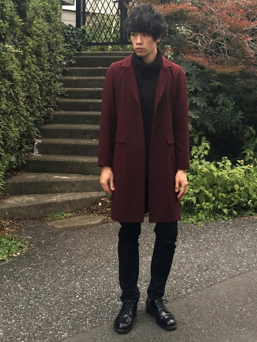 ワインレッドとの相性最高ですね!落ち着く大人の組み合わせです!ゴチャゴチャしすぎずシンプルにまとめた上でワインレッドのコートがしっかり目立ってます!
