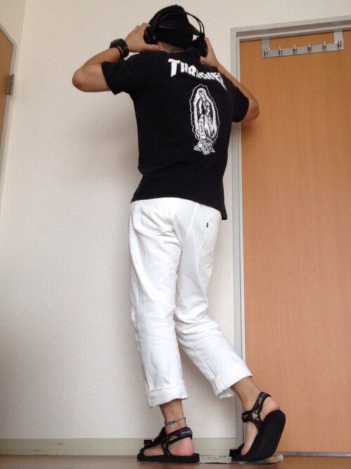 シンプルにカッコイイバックロゴ黒Tと白パンツのコーデ!やっぱり相性抜群ですね!
