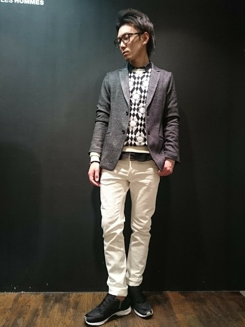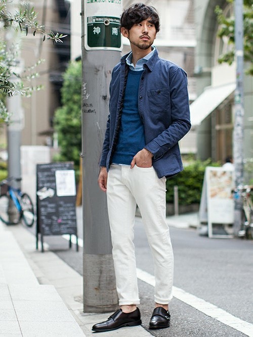 インナーとシューズを黒でまとめると白パンツが凄く目立ちカッコイイです!プラス1として濃紺のデニムジャケットもとても似合っていますね!