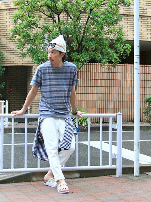 ボーダーTシャツと白パンツを合わせた爽やかコーデ!腰巻きには可愛いギンガムチェックシャツを巻き、サンダルも白で合わせているところはとてもオシャレです!