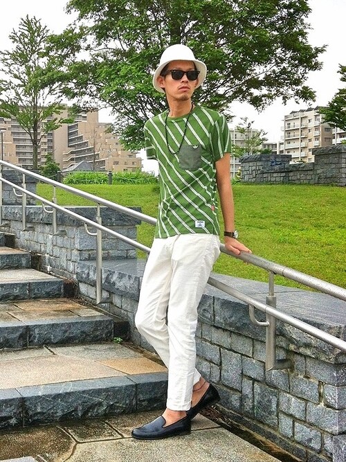 原色グリーンも爽やかな白と合わせればとってもオシャレ!ハットを白にしてることで統一感でてますね!