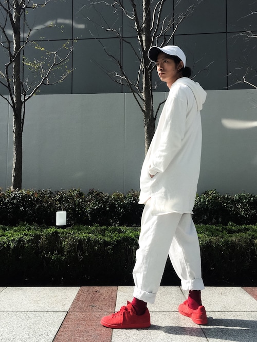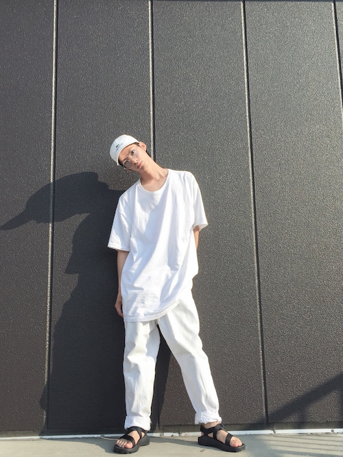 キャップ、トップス、ボトムスと全てにおいて白をもってきたスタイル!清潔感溢れますね!