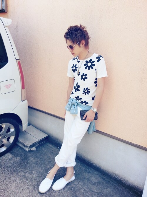 可愛い花柄Tシャツでアクセントをつけた白コーデ!腰巻でもアクセントを加えておりとっても爽やかです!