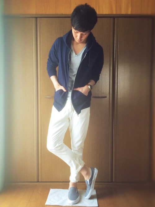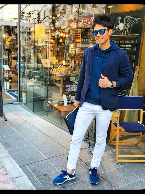 ジャケットパーカースタイルもネイビーでまとめることで白パンツとの相性抜群!足元もネイビーのスニーカーで揃えることで大人カジュアルスタイルを演出しています!