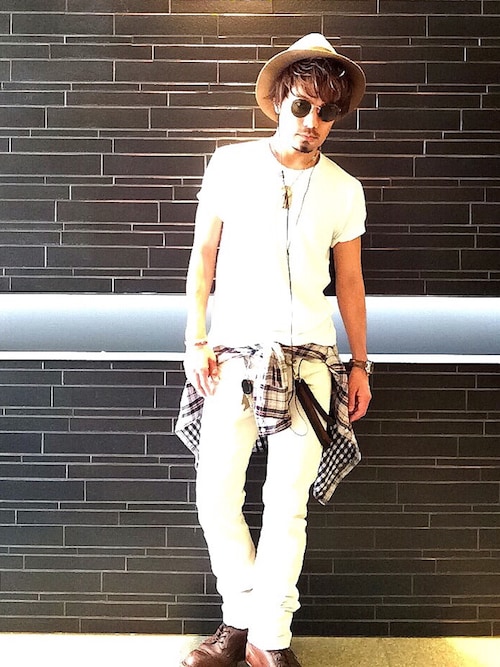 見た瞬間カッコイイと思えるスタイル!オールホワイトと思いきや腰巻や靴でしっかりと色をいれるのもオシャレの着こなしです!