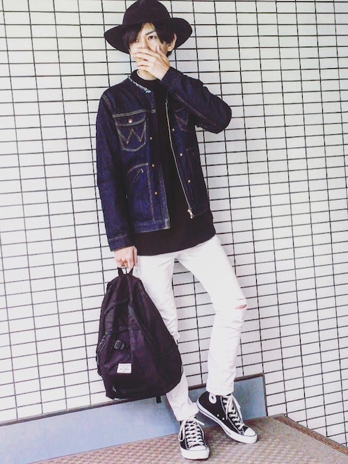 男くさいデニムジャケットコーディネートをもう1つご紹介!白パンツは色柄どうしても弱弱しく見られがちですがダメージを使用する事で男くささを更にだしていてとても素敵です!