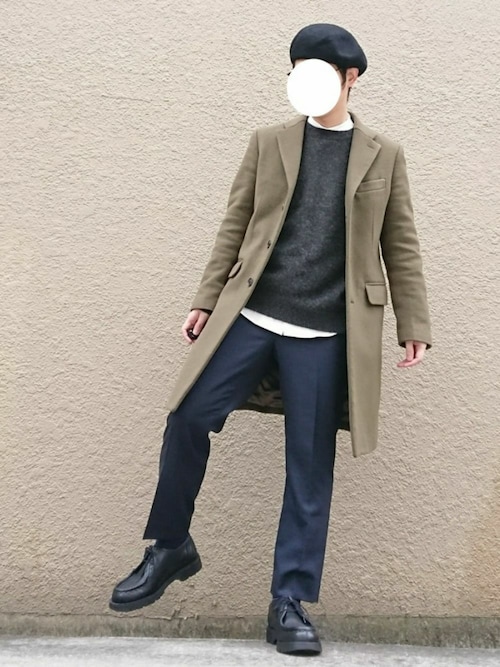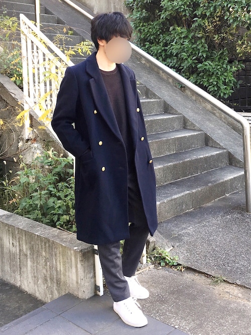綺麗なネイビーのチェスターコートに合わせたコーディネートです。チェスターコートはどちらかというとカッチリしてるイメージなのでスニーカー外しはとても良いですね!